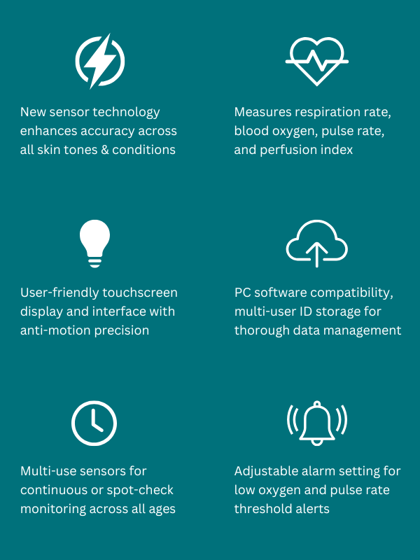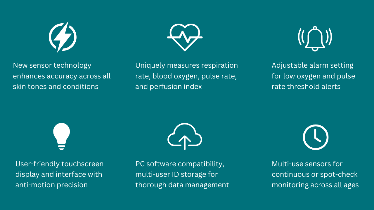The CH-100 pulse oximeter includes a new charging base and a large touchscreen interface, which provides adjustable audio and visual alarms for low oxygen and pulse rate alerts. With the use of new sensor technology, the CH-100 oximeter delivers enhanced reliability and accuracy across all age groups and skin tones.