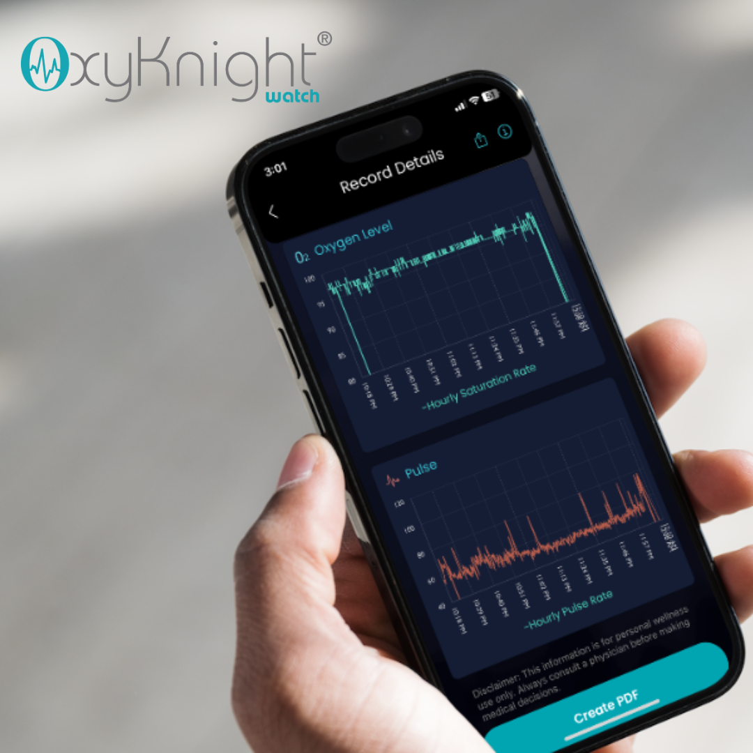 The OxyKnight® Watch can be connected to its mobile app via Bluetooth, allowing users to access detailed reports that show sleep trends and sleep quality. These comprehensive reports can then be downloaded into PDF format, making them easy to share with physicians or caregivers. The OxyKnight® Watch can continuously monitor and track vital health metrics, allowing for in-depth insights and personalized care. Available for download on both IOS and Android, click here for more info about the app.