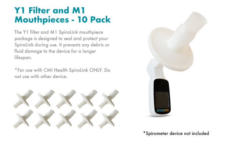 The Y1 filter and M1 mouthpiece are designed for use with the CMI Health SpiroLink® smart spirometer. The filter and mouthpiece are for added seal and protection, preventing debris or fluid damage from occurring while using the device. This bundle includes 10 filters and 10 mouthpieces.